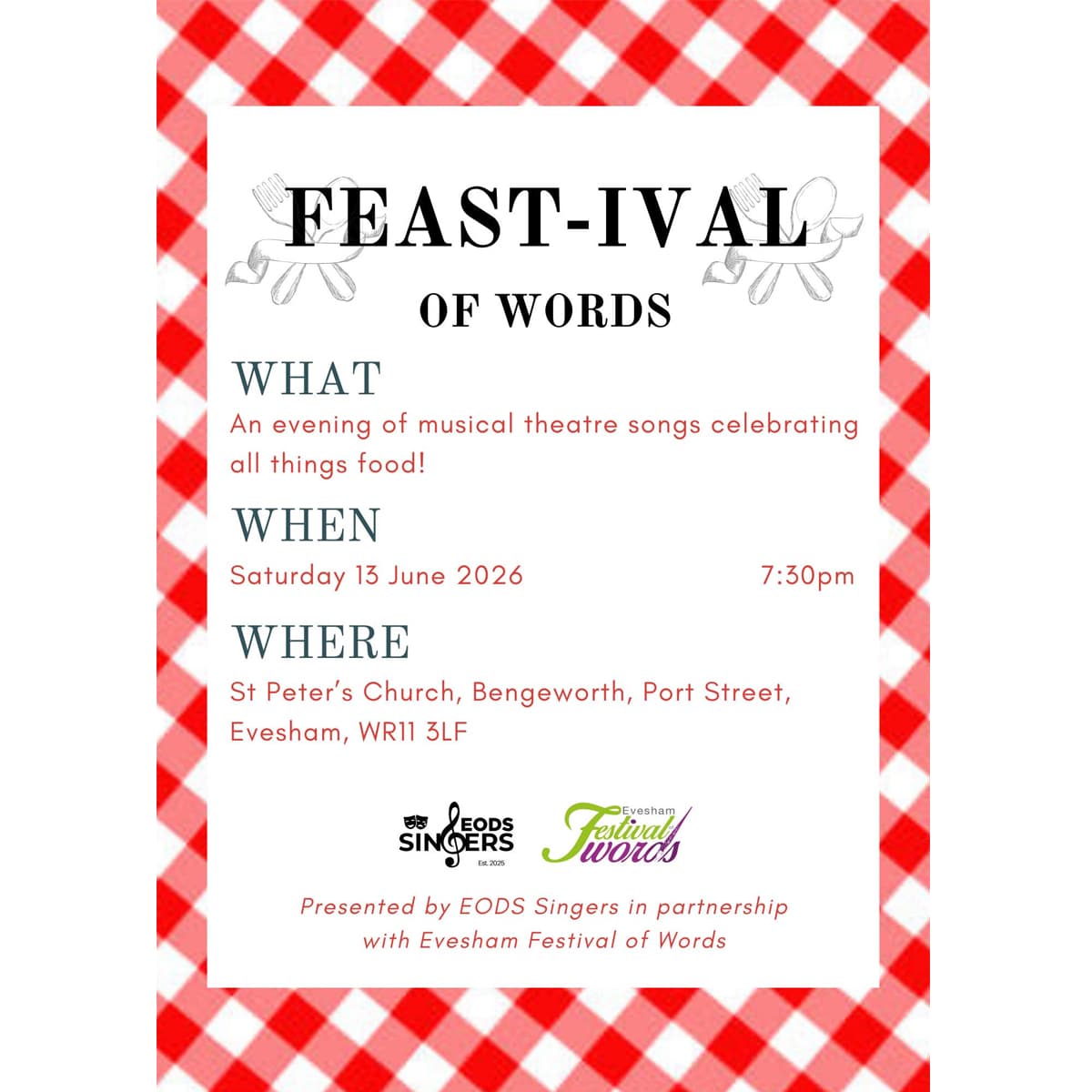 The wonderfully talented EODS (Evesham Operatic and Dramatic Society) Singers return to Evesham Festival of Words and Bengeworth Church with a new concert – an evening of musical theatre songs, celebrating all things food!
