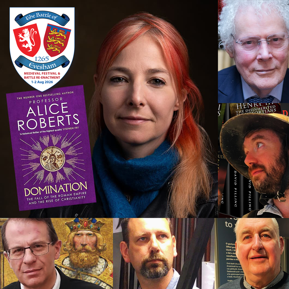 Once again, the Battle of Evesham Festival weekend includes a fantastic series of talks by historians and others, all taking place in the Presentation Marquee on the Crown Meadow. Headlining the weekend is Professor Alice Roberts, who will be familiar to all from her TV programmes. Her talk, DOMINATION: The Fall and Rise of an Empire, is on 1st August at 4pm.