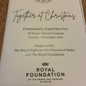 What an honour, as Chair of Evesham Festival of Words, to be asked to do the first reading (the Story of Eof and Egwin and the founding of Evesham Abbey) at the Together at Christmas Community Carol Service at All Saints Church on 7th December. Supported by HRH The Princess
